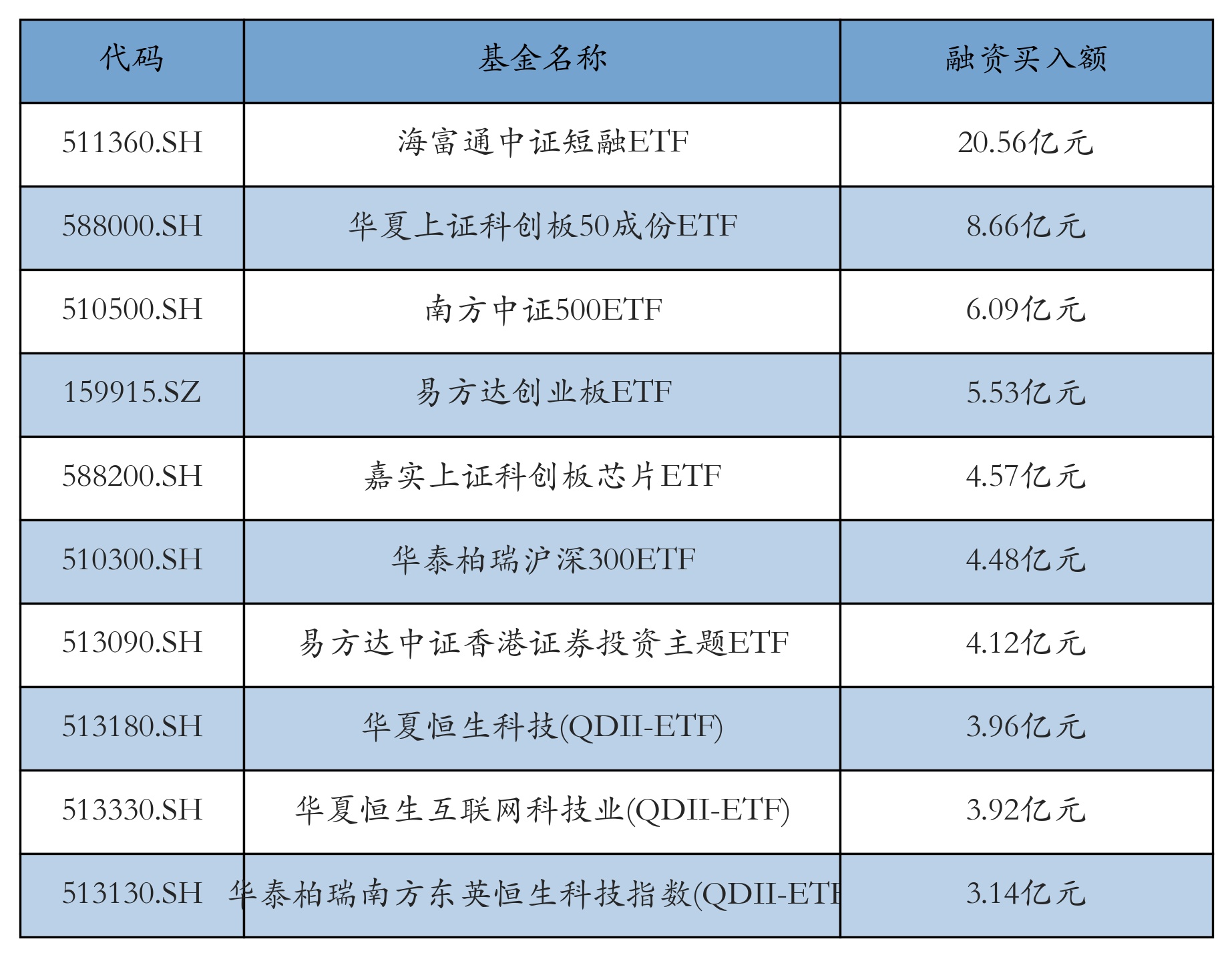 12月23日ETF融资买入额前三位分别为:海富通中证短融ETF(20.56亿元)、华夏上证科创板50成份ETF(8.66亿元)和南方中证500ETF(6.09亿元),前10具体见下表: