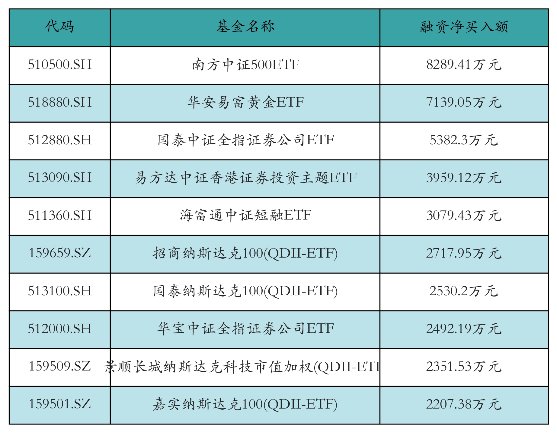 12月23日ETF融资净买入额前三位分别为:南方中证500ETF(8289.41万元)、华安易富黄金ETF(7139.05万元)和国泰中证全指证券公司ETF(5382.3万元),前10具体见下表:
