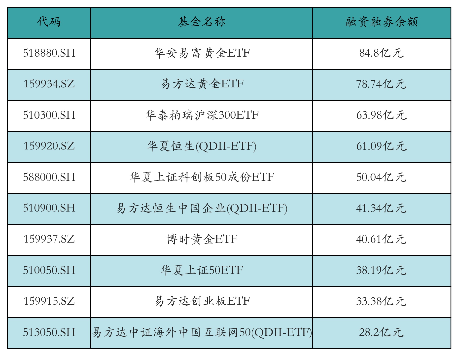 12月23日ETF两融余额前三位分别为:华安易富黄金ETF(84.8亿元)、易方达黄金ETF(78.74亿元)和华泰柏瑞沪深300ETF(63.98亿元),前10具体见下表: